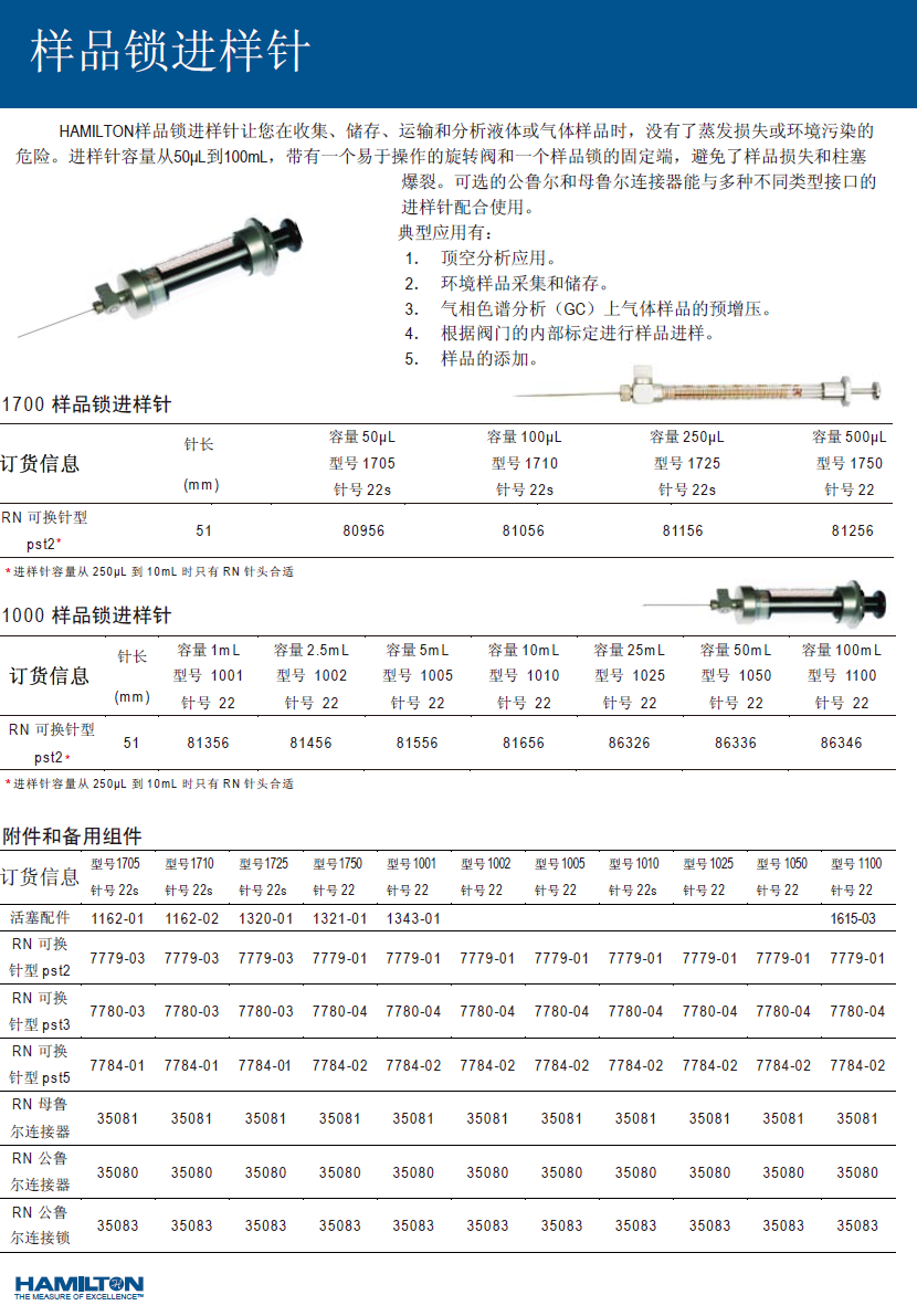 HAMILTON样品锁进样针的典型应用: