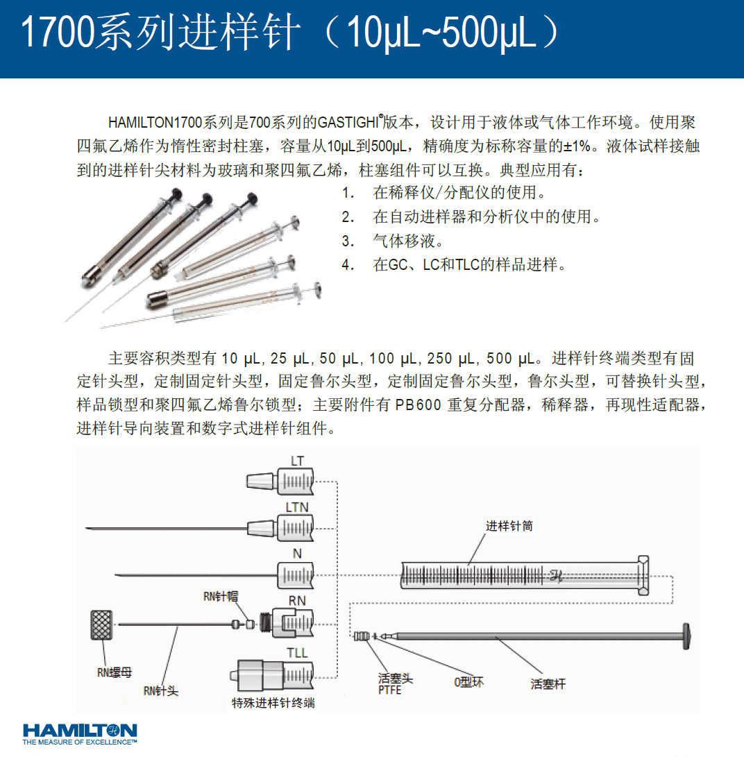 Hamilton 1700系列气密性进样针(10uL-500uL)是700系列的GASTIGHT(气密性)版本,是700系列的升级版,设计用于液体或气体工作环境。使用聚四氟乙烯PFTE作为惰性密封柱塞,主要容量有10uL、25uL、50uL、100uL、250uL、500uL,精确度为标称容量的+/-1%。液体样品接触到的进样针尖材料为玻璃和聚四氟乙烯,柱塞组件可以更换。典型应用有: