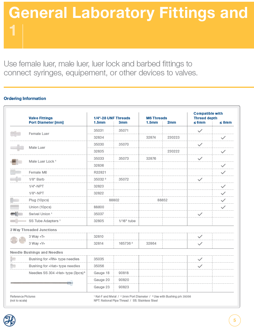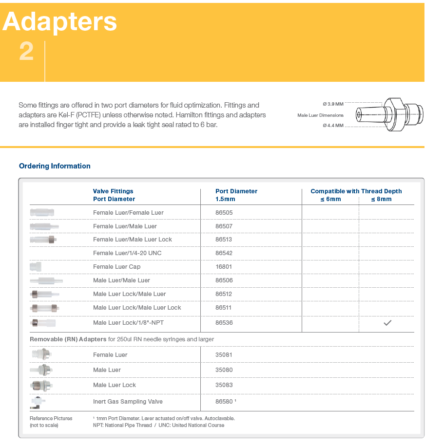 Hamilton Company offers a series of adapters that convert a large hub removable needle (RN termination) syringe to a Luer connection. There are three different removable adapters for 250 µL and larger syringes. The adapters convert the RN termination into either a Male Luer, Male Luer Lock or a Female Luer Lock connection. The adapter has a port inner diameter of 0.039 inches that allows for sample spiking through a syringe fitted with a 26 gauge needle or smaller.