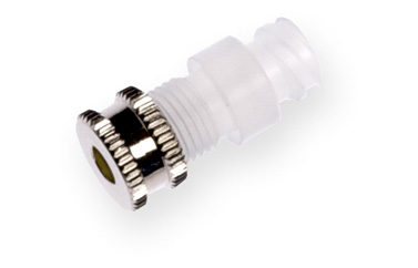 The Septum Adapter connects to any PTFE-Luer Lock (TLL) or Luer Tip (LT) syringe. The adapter seals the syringe barrel but the sample remains accessible by piercing the replaceable septum.